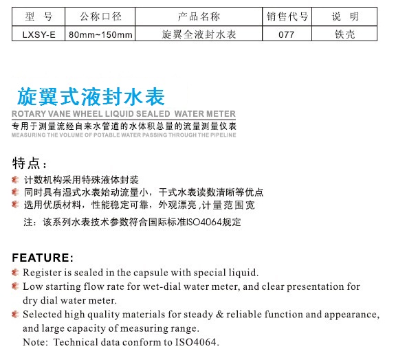 :Rotary vane wheel liquid sealed water meter